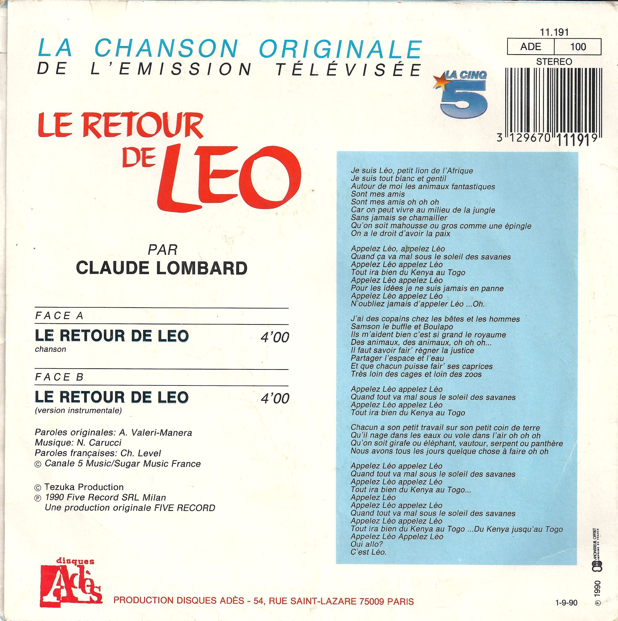 disque dessin anime retour du roi leo la chanson originale de l emission televisee le retour de leo
